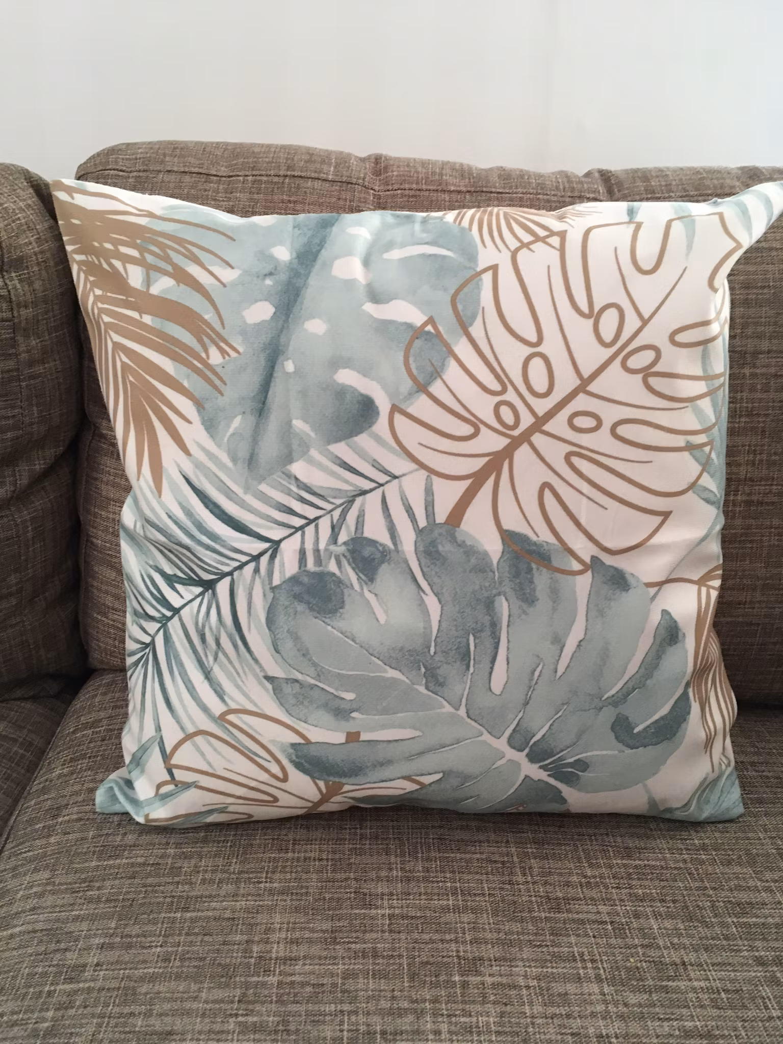 Kuddfodral med blad multifärgad på fram sidan och bak sidan är vitfärgad.