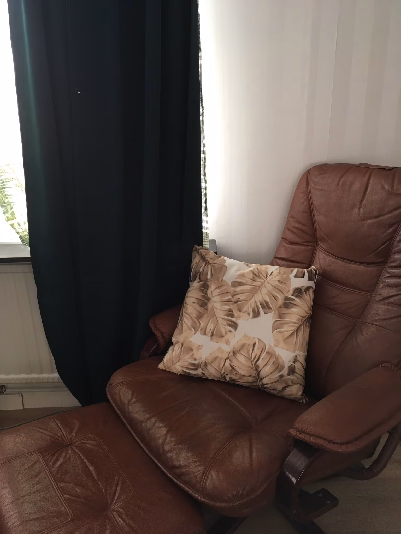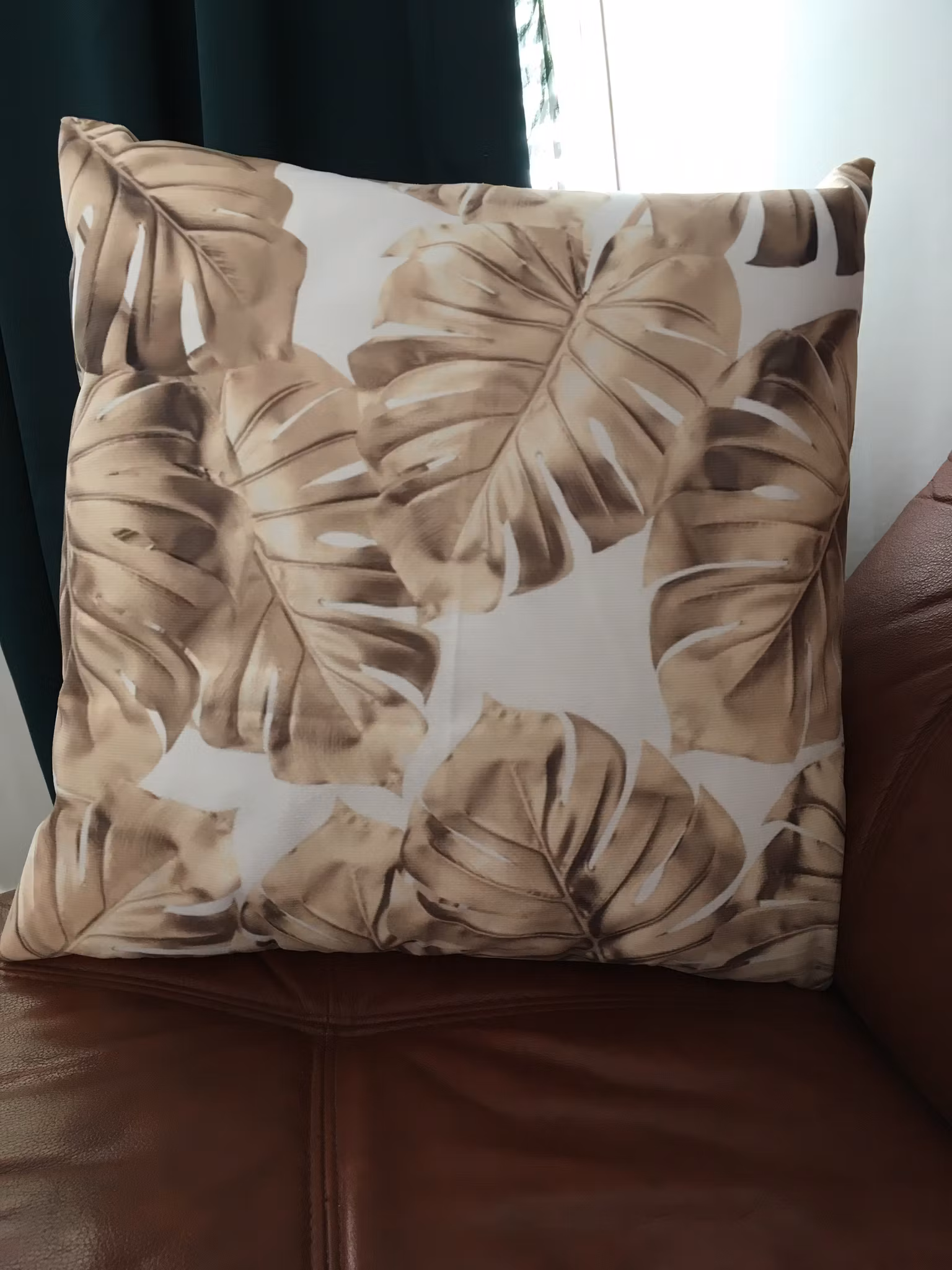 Kuddfodral med bladmotiv multifärgad på fram sidan och bak sidan är vitfärgad.